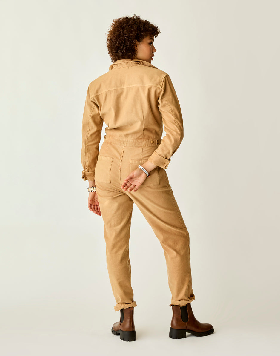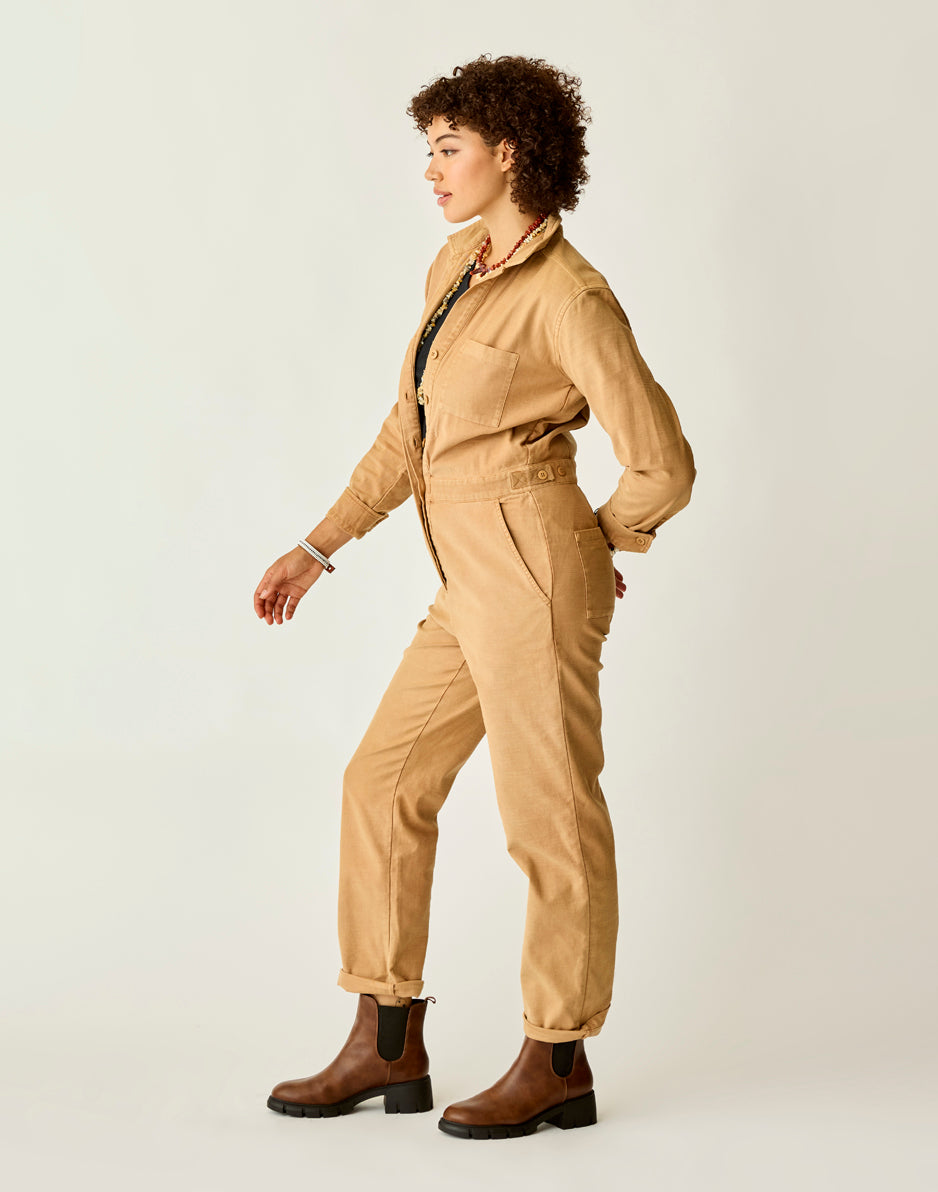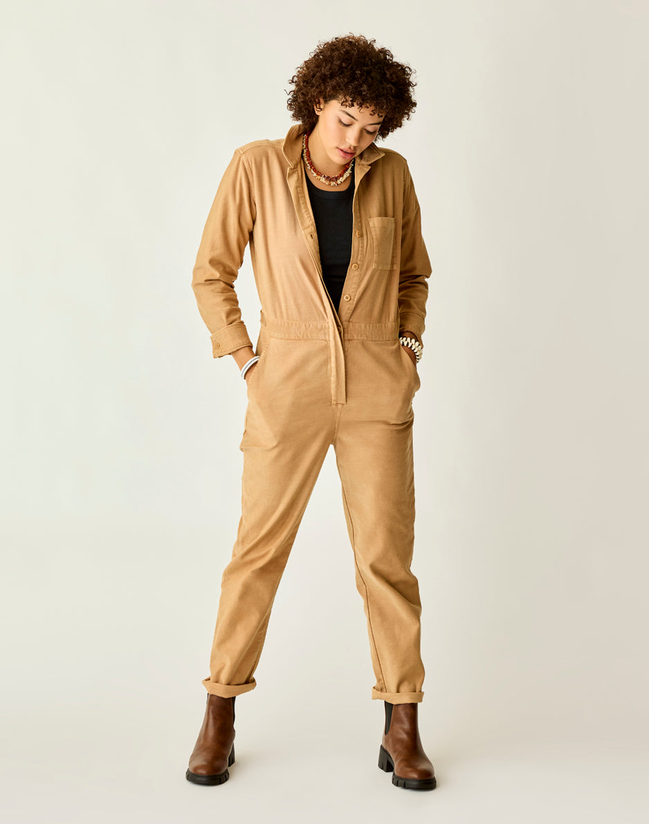 Suit up with the Bedford, it knows how to party. Organic cotton, front scoop pockets and adjustable waist tabs seal the deal. Wear this relaxed, straight leg jumpsuit fit cuffed or uncuffed to show its raw hem. T This product runs slightly small. If you want a relaxed fit, size up. If you want slim fit, order your regular size.