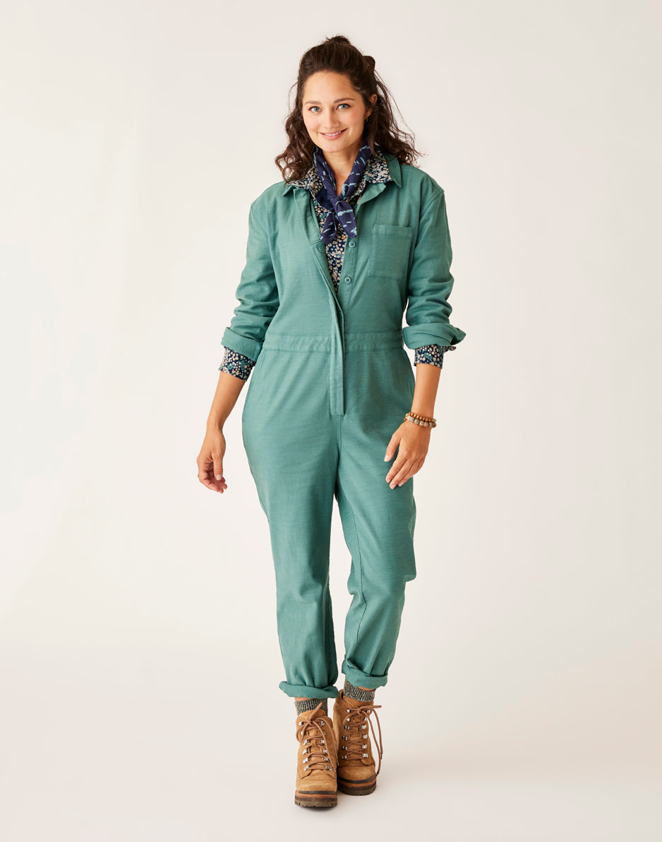 Suit up with the Bedford, it knows how to party. Organic cotton, front scoop pockets and adjustable waist tabs seal the deal. Wear this relaxed, straight leg jumpsuit fit cuffed or uncuffed to show its raw hem. T This product runs slightly small. If you want a relaxed fit, size up. If you want slim fit, order your regular size.