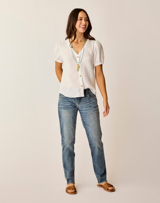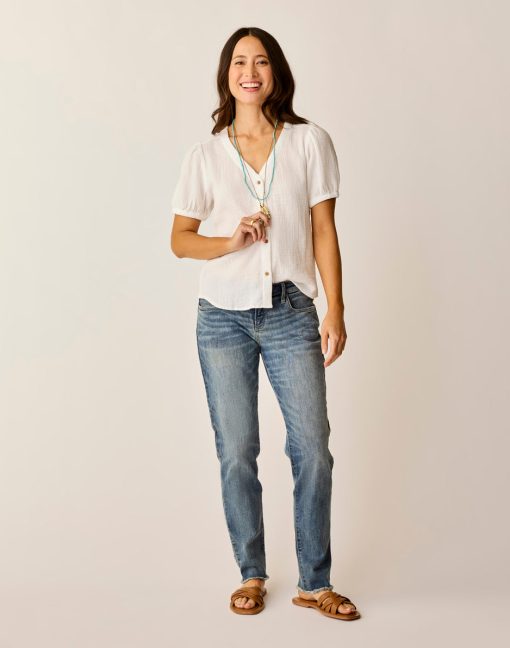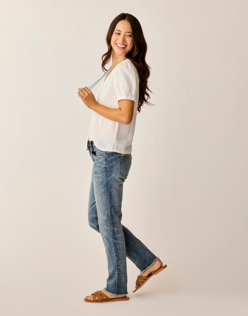 Nearly 50,000 sold. Over 500 five-star ratings. A slimmed down spin on the boyfriend cut, the best selling Carson is everything you want a good pair of jeans to be. Mid rise, relaxed with a little stretch. Wear them cuffed for a cropped length or rock the raw hem and longer inseam. *This jean is intentionally oversized. We recommend sizing down from your regular size if you like a more tailored fit. Models pictured are both wearing a size 6 jean but are regular sizes 6 and 8 so you can see the difference in fit.