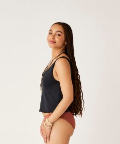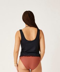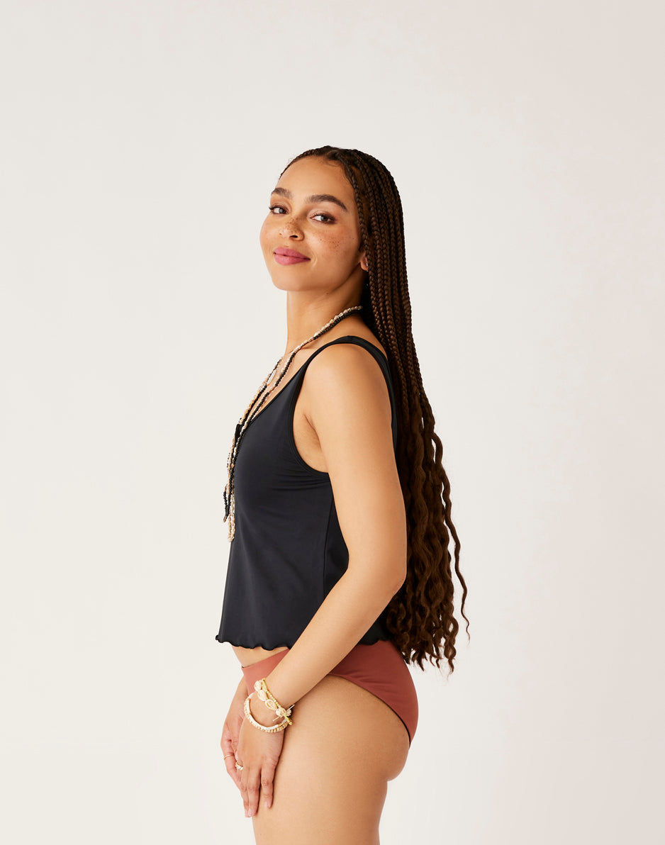Business on top and party on the bottom is a recipe for success and the Vida Notchneck Tankini is no exception, with its merrow hem detail, floating shelf bra with removable pads.