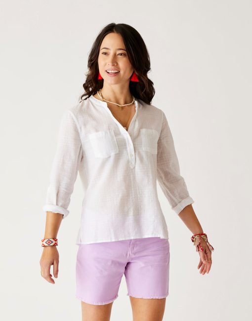 Simple sophistication make this lightweight summer top a weekend bag must. Chest pockets and three button open V-neck dial in the vibe in stride.